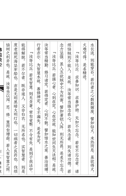 汝等当以闻、 是故, 恼树之利斧也。 思、 若人有智慧之照, 慧而自增益。 修、 亦 也, 船 是 黑 明 无 病 老 度 死 牢 坚 海 暗 良 之 者 药 烦 伐 也, 灯 明 大 也, 病 切 一 非 既 者, 又 人, 道 尔 解 得 能 不 若 脱。 慧 智 实 是 则 者, 也。 衣, 白 非 名 所 无 行者亦尔,为智慧水故,善修禅定,令不漏失。是名为定。 若得定者, 修习诸定。 汝等常当精勤, 善治堤塘。 譬如惜水之家, 心则不散。 虽入五欲贼中不为所害。 念力坚强, 譬如著铠入阵, 是名不忘念。 则无所畏。 汝 故, 是 当 常 等 入。 贼 恼 烦 能 不 则 摄 诸 失 则 若 德。 功 者, 心。 在 念 念 失 若 火难可得。是名精进。 若行者之心数数懈废, 则能穿石。 水长流, 虽欲得火, 未热而息, 譬如钻火,