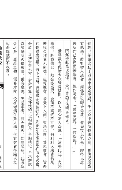 如杀怨贼而不欢喜? 为 名 假 在 没 身, 物, 身, 之 舍 之 恶 罪 老 得 者 智 之, 灭 除 有 死 生 病 何 海。 大 实 世 暗。 无 脆, 危 痴 慧 智 以 诸 灭 明 坚 病。 恶 除 应 是 此 如 我 者, 牢 灭, 得 今 会必有离, 当知世皆无常, 是故, 勿怀忧恼。 早求解脱, 当勤精进, 世相如是, 自今以后, 已作得度因缘。 则是如来法身常在而不灭也。 我诸弟子展转行之, 可 应 益。 度 天 若 者, 久 我 若 住 所 无 更 未 其 ; 度 亦 皆 者, 间, 人 上 皆 度 已 悉 法 人 利 足, 具 皆 劫 一 会 当 亦 世 恼! 悲 若 住 我 可 不 得。 利 自 终 会 灭, 而 离 不 若所作已办已度苦海者,但作是念:「世尊灭度,一何疾哉!」』 闻 者, 法 说 所 佛 入 感。 悲 有 初 有 若 即 即 光, 电 道。 见 得 见 度, 得 皆 夜 如 譬 中 谛 四 决 疑。 无 定 是 尊