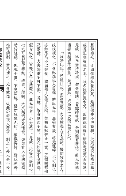 当急挫之, 难可禁制, 无令放逸。 制之一处无事不办。 纵此心者丧人善事, 见 不 蜜, 譬 坑。 深 于 轻 转 动 观 但 躁, 腾 树, 得 踯, 踔 跃 猴 象 狂 如 猿 钩, 无 恶兽、 心之可畏甚于毒蛇、 怨贼, 譬如有人手执蜜器, 大火越逸未足喻也。 此五根者, 皆亦不久见其磨灭。 假令纵之, 汝等当好制心。 是故, 心为其主。 不 可 不 故, 是 慎。 重 世, 累 及 甚 害 为 智 不 贼 如 逸, 纵 令 之 而 制 者 持 随, 不 贼 苦 止 如 被 劫 一 贼 祸 殃 世, 五 根 陷。 不 以 辔 马 亦 如 恶 制, 坠 于 坑 人 将 当 牵 若纵五根, 不令纵逸犯人苗稼。 执杖视之, 不可制也。 将无涯畔, 非唯五欲, 诸善功德皆不得生。是以当知,戒为第一安隐功德住处。 勿令毁缺。 比丘当持净戒, 是故, 若无净戒, 是则能有善法。 若能持净戒, 名 故 本, 波 木 提 罗 正 是 戒 顺 之 脱 解 叉。 及 定