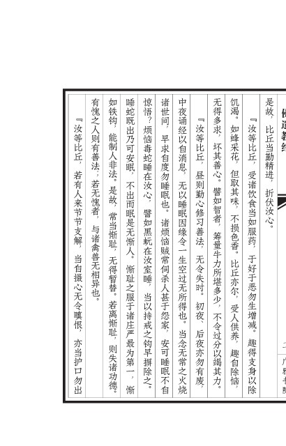 有愧之人则有善法;若无愧者,与诸禽兽无相异也。 是故, 能制人非法。 如铁钩, 常当惭耻, 则失诸功德。 若离惭耻, 无得暂替。 出 不 眠, 而 无 是 眠 既 蛇 睡 出 安 可 乃 惭 最 严 庄 为 惭 一, 第 耻 惭 人。 之 诸 于 服 心, 汝 在 黑 如 譬 睡 烦 悟? 惊 蛇 毒 恼 人 杀 于 甚 贼 恼 伺 常 眠 睡 自 不 家, 怨 可 安 早 求 自 诸 世 间, 度 也。 诸 烦 勿 睡 眠 睡 以 无 眠 令 缘 因 息, 诵 夜 中 经 消 自 以 无 念 当 常 烧 火 之 也。 空 生 一 过 得 所 无 坏其善心。 无得多求, 譬如智者, 不令过分以竭其力。 筹量牛力所堪多少, 但取其味, 如蜂采花, 饥渴。 不损色香。 趣自除恼, 受人供养, 比丘亦尔, 是故,比丘当勤精进,折伏汝心。