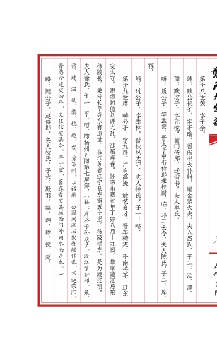 略:隨公子。赵侍郎。夫人狄氏。子六:殿羽、豁、渊、静、悦、楚。 第卅九世庠:畴公子,字元序。广有高操,敏艺多才。晋车骑吏、平南将军,迁东 隨:过公子,字季林。晋扶风太守。夫人徐氏。子一:略。 晋太子中书侍郎兼校尉, 字孟宗。 畴:质公子, 临、 子二:庠、 夫人陈氏。 邛二县令。 豫:默次子,字元悦。黄门侍郎,迁尚书。夫人卓氏。 球:默公长子,字子瑜。晋尚书太仆射,赠金紫大夫。夫人吕氏。子二:滔、津。 第卅八世羡:字子余。