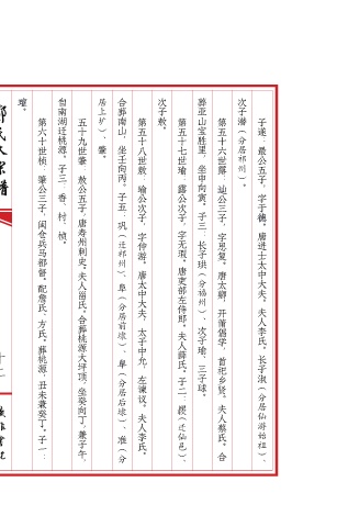 配詹氏、 闽仓兵马都督。 第六十世桢:肇公三子, 方氏。 子一: 丑未兼癸丁。 葬桃源, 夫人甾氏。 唐寿州刺史。 五十九世肇:敖公五子, 兼子午, 坐癸向丁, 合葬桃源大坪顶, 第五十八世敖:瑜公次子,字仲游。唐太中大夫,太子中允,左谏议。夫人李氏。 子二: 夫人薛氏。 第五十七世瑜:露公次子, 字无瑕。 唐吏部左侍郎。 第五十六世露: 字于 子遂:最公五子,